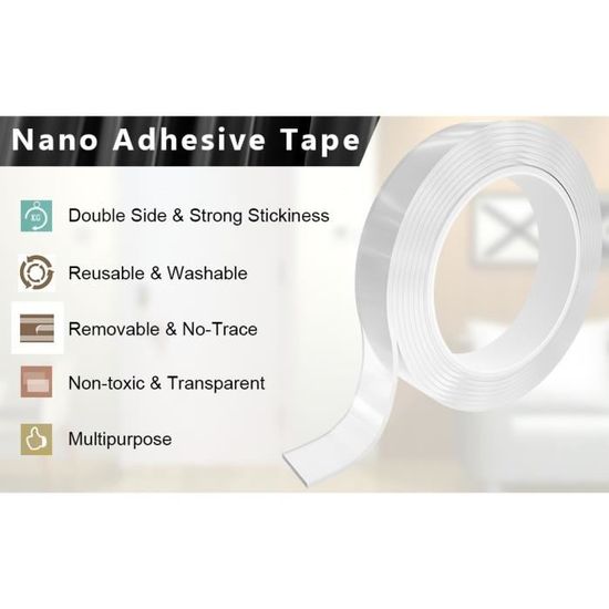 Découvrez le ruban adhésif nano réutilisable Omystore, idéal pour tous vos besoins de fixation ! Avec ses 6 mètres de longueur, ce ruban double face est lavable, sans traces et super adhérent, s’adaptant à toutes les surfaces lisses. Pratique et multifonctionnel, il vous permet de coller et décoller facilement sans endommager vos murs.