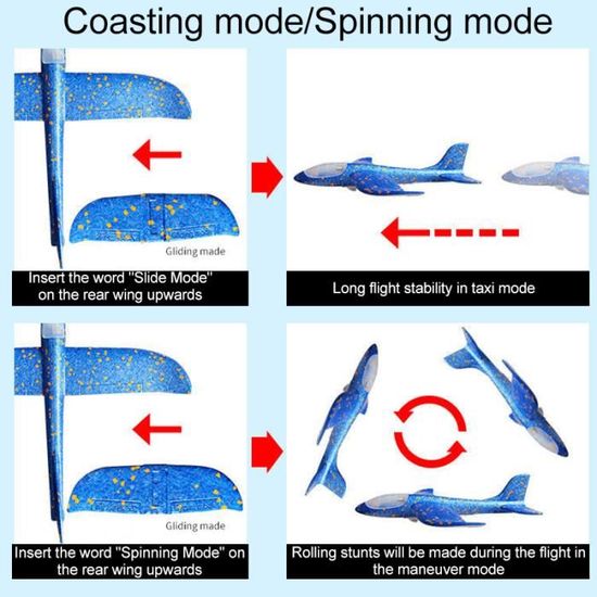 Notre jouet d’avion se distingue par sa conception astucieuse, comprenant deux modes de vol : le mode horizontal et le mode de rotation. Grâce à des ajustements simples des ailes, vos enfants peuvent expérimenter différents styles de vol, stimulant ainsi leur créativité et leur sens de l’aventure. Ce jouet ne se contente pas de divertir ; il aide également à développer la coordination main-œil, l’observation et le sens de l’orientation des enfants.