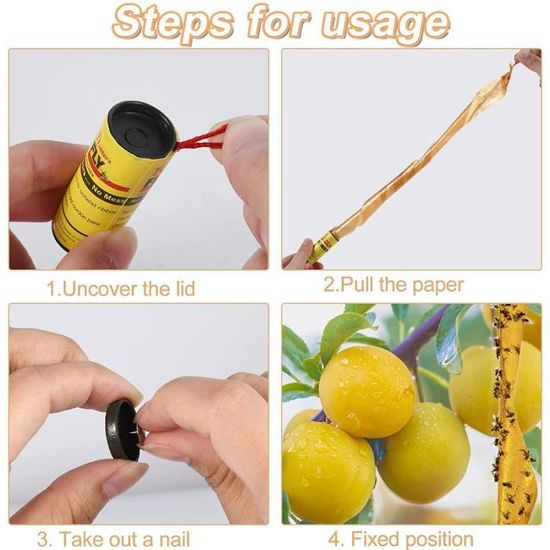 L’utilisation de notre Attrape Mouche Papier est d’une simplicité enfantine. Il vous suffit de retirer l’anneau, de le déplier en forme de bande et de le coller directement dans un pot ou sur un arbre fruitier. Pour des résultats optimaux, accrochez-le dans un endroit où les mouches sont particulièrement présentes. Dites adieu aux moustiques et profitez pleinement de votre espace extérieur !