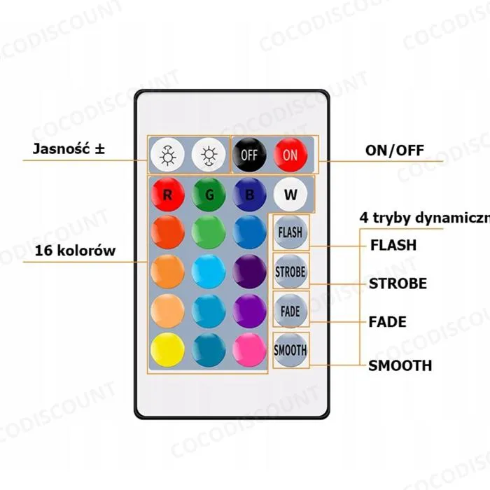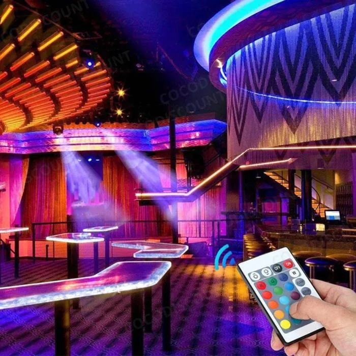 Équipée de 300 LED SMD 3528 montées sur une bande adhésive double face résistante, cette bande LED RGB est facile à installer et parfaitement adaptable à tous vos projets. La télécommande incluse permet un contrôle total : réglage de l’intensité lumineuse, allumage/extinction, choix parmi 16 couleurs statiques, mode clignotant FLASH, transition progressive sur 7 couleurs, et mode automatique pour un cycle complet de couleurs.