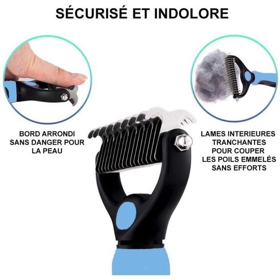 acheté pour un chat à poils longs qui avait des touffes emmelées et des noeuds enlève les poils du chat en les coupant en même temps sans tirer trés bien !!
