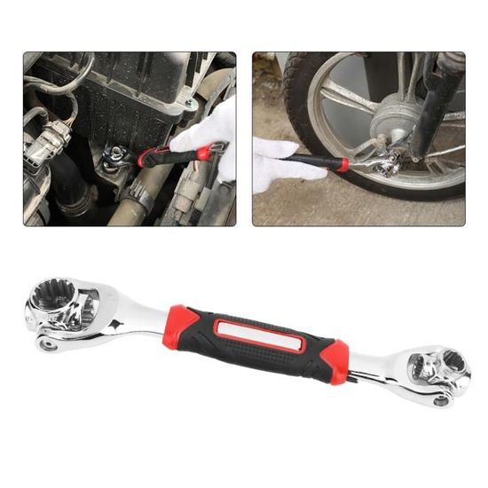 Manche solide ainsi que son maintien, au niveau des douilles par contre, je trouve qu’elles ressortent trop et ça fait trop d’épaisseur, surtout si on à des boulons à démonter ou quelque chose gêne à coté (ce qui arrive souvent), dans ce cas cette clé ne sert à rien. Ça peut dépanner pour qui n’a pas de caisse à outils. Niveau solidité, je ne pense pas que ce soit top (à premiere vue), pas aussi solide qu’une clé, mais ça peut aller. Je regrette surtout toute cette largeur que prend la douille autour du boulon, on ne doit rien avoir autour qui gene le démontage plus d’1cm autour…