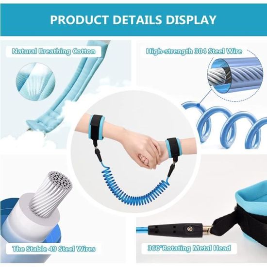 2. Anti-perdu de haute qualité : Notre bracelet est fabriqué avec une boucle en métal en acier inoxydable intégrée à un système de rotation à 360°. À l’intérieur, un fil d’acier assure une durabilité exceptionnelle et une résistance à l’usure. Ce produit est conçu pour être difficile à couper avec un couteau, garantissant ainsi une sécurité optimale pour vos enfants.