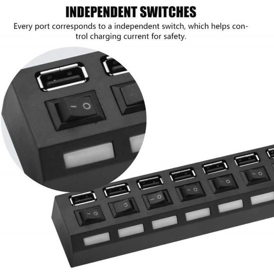 Chaque port est équipé d’un commutateur indépendant, vous offrant un contrôle total sur le courant de charge de chaque périphérique. Cela signifie que vous pouvez activer ou désactiver chaque port selon vos besoins, garantissant ainsi une utilisation sécurisée et évitant tout risque de surcharge.