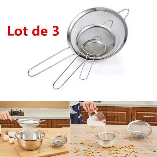 - Trois passoires parfaites pour tamiser et filtrer des ingrédients humides ou secs.