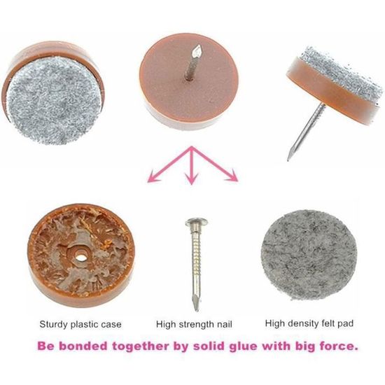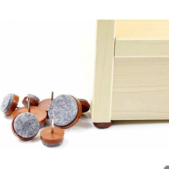 La mise en place de ces patins est un jeu d’enfant ! Il vous suffit de les fixer sous vos meubles en bois à l’aide d’un simple marteau. Pour une installation encore plus aisée, nous vous recommandons de pré-percer un trou pilote sur les bois durs. Cela permettra d’éviter que les clous ne se plient ou que les boîtiers en plastique ne se cassent, tout en préservant l’intégrité des pieds de vos meubles.