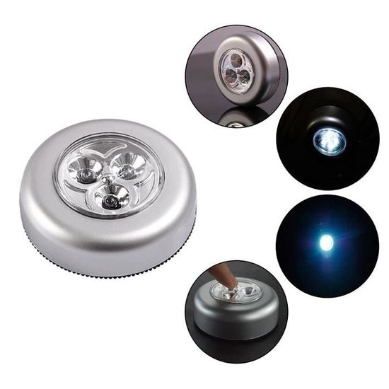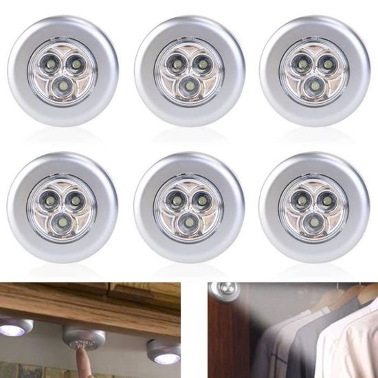 Transformez vos espaces sombres en lieux lumineux grâce à notre lot de 6 lampes à LED autocollantes. Chacune de ces lampes compactes mesure 6,5 cm de diamètre et 2 cm d’épaisseur, et fonctionne avec 3 piles AAA (non fournies). Elles sont idéales pour éclairer vos penderies, placards, étagères, cuisines, entrées, et bien plus encore.