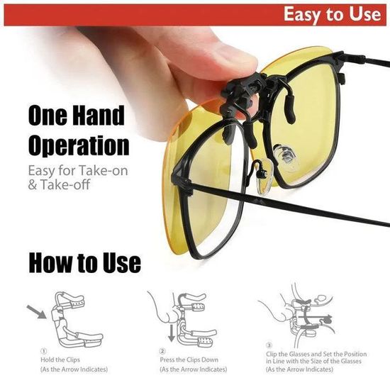 • Réduction de l’Éblouissement : Les verres jaunes de la paire nocturne filtrent la lumière bleue et réduisent l’éblouissement des phares des autres véhicules, vous permettant de conduire avec une vision claire et sans fatigue oculaire.