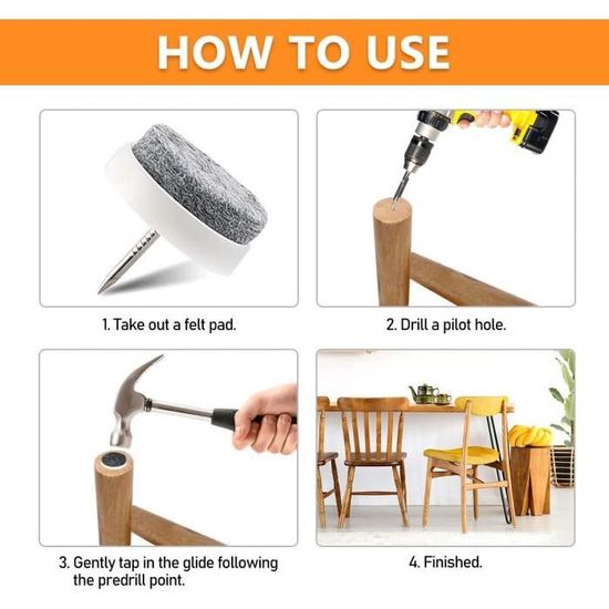 L’installation des patins à vis Haggiy est un jeu d’enfant. Il vous suffit de visser chaque patin sous vos meubles, et le tour est joué ! En quelques minutes, vous transformez vos chaises, tables et autres meubles en éléments respectueux de vos sols.