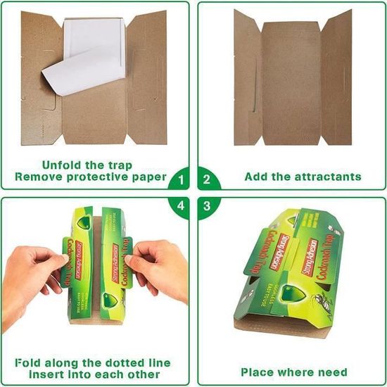 - Facilité d’Utilisation : Il vous suffit de déballer le piège et de le placer dans les zones stratégiques de votre maison, telles que la cuisine, la salle de bain ou les endroits sombres où les cafards aiment se cacher.