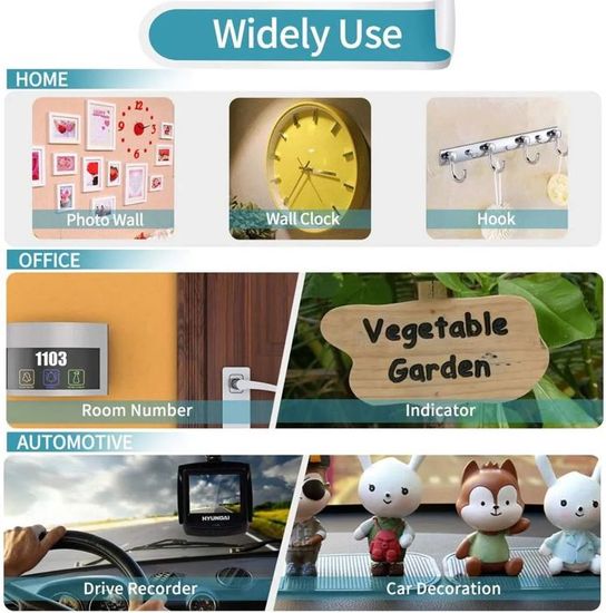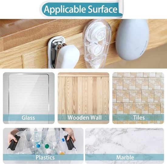 - Pouvoir adhésif extra fort : Sa puissance d’adhésion garantit une fixation fiable sur divers types de surfaces, qu’il s’agisse de murs, de meubles, de verre ou de plastique.