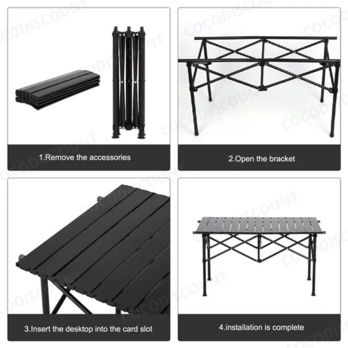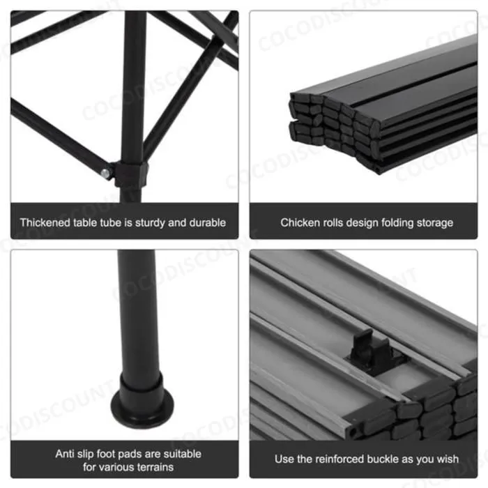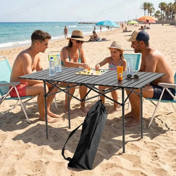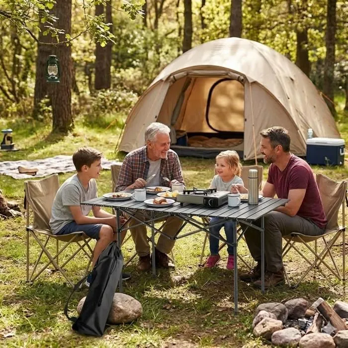 Sa structure en aluminium renforcé garantit une excellente durabilité et stabilité, tandis que son plateau étanche et facile à nettoyer résiste aux éclaboussures, à la pluie et aux résidus alimentaires. Avec ses dimensions 118 × 55 cm et sa hauteur de 49 cm, elle offre un espace confortable pour partager un repas, installer votre matériel ou profiter de vos loisirs en plein air.