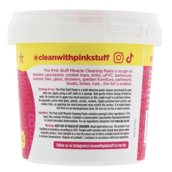 La pâte de nettoyage The Pink Stuff est non seulement efficace pour éliminer les taches de calcaire et de rouille, mais elle est également parfaite pour nettoyer des grilles, des éviers, des bateaux, des carreaux, des casseroles et des poêles, ainsi que du mobilier d’extérieur et d’intérieur. Sa formule 100% naturelle garantit une utilisation sans danger, ce qui la rend moins nocive que la plupart des nettoyants ménagers disponibles sur le marché aujourd’hui.