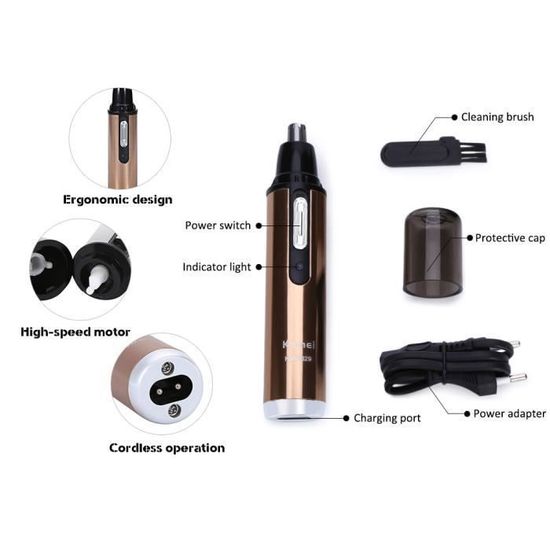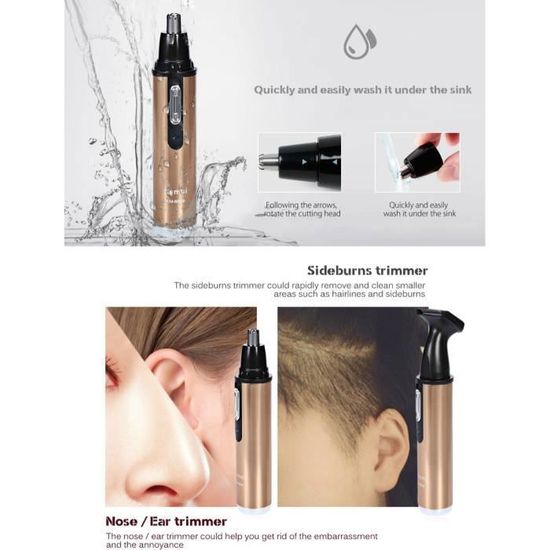 • Tête de coupe exigu : La conception de la tête de coupe permet d’attraper et d’enlever rapidement et sans douleur les poils indésirables, que ce soit au niveau du nez, des oreilles ou des favoris.