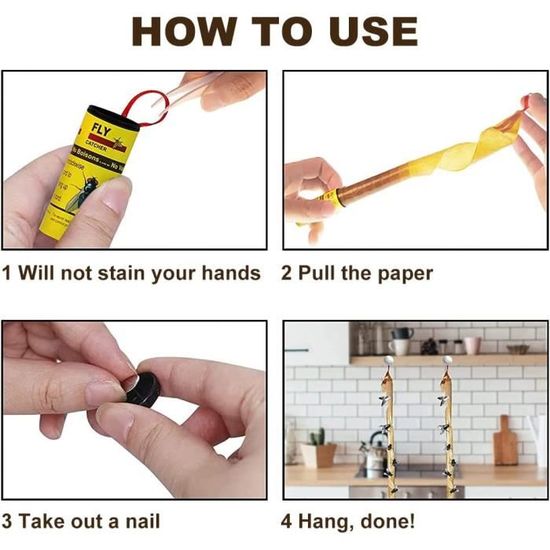 Pas besoin de vous compliquer la vie ! L’utilisation de notre rouleau attrape mouche est d’une simplicité déconcertante. Il vous suffit d’accrocher les bandes de piège à proximité des sources d’attraction pour obtenir des résultats optimaux. Oubliez les appâts, les poisons ou les vapeurs toxiques : notre piège fait le travail sans tracas. En cas de contact accidentel avec l’adhésif, utilisez simplement de l’huile végétale et du détergent pour enlever la colle des vêtements ou autres surfaces.